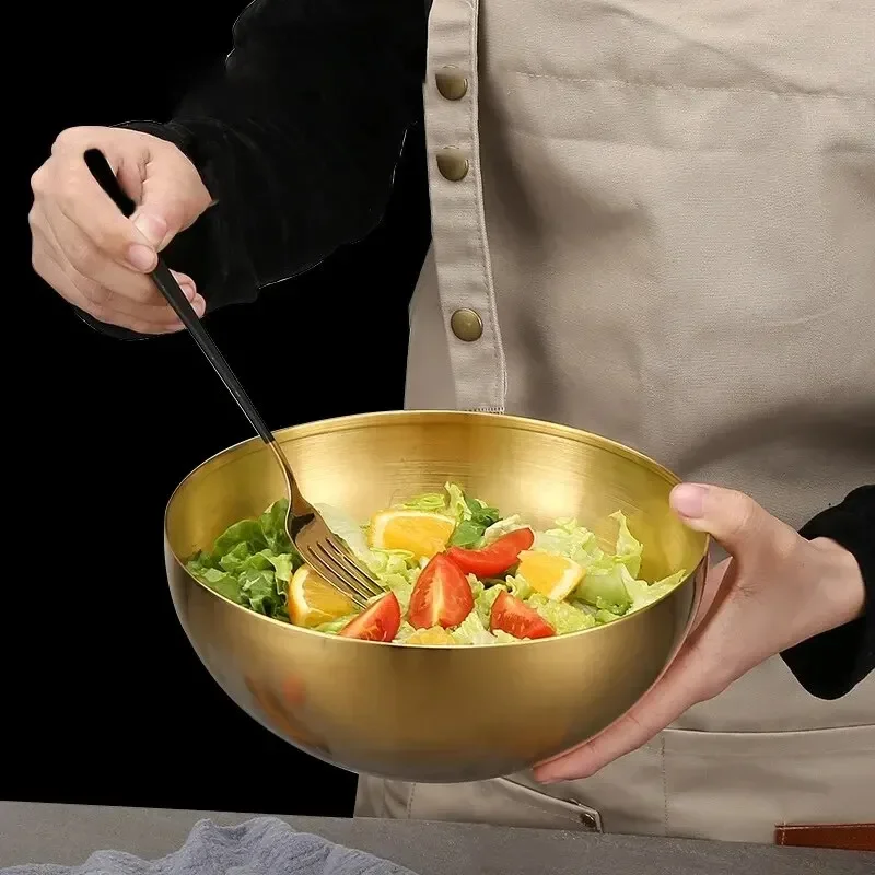 The stunning gold and silver finishes of the stainless steel bowl elevate its aesthetic appeal. These metallic hues offer a touch of sophistication, making it perfect for both everyday use and elaborate gatherings. Impress your guests by using these bowls during family dinners, upscale banquets, or outdoor picnics. With such a stylish design, this bowl not only functions as a food container but also acts as a decorative centerpiece for your kitchen tableware.